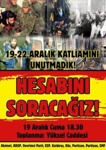 Partizan X Hesabı’ndan yaptığı paylaşımda; “’19-22 Aralık Hapishaneler Katliamını unutmadık! Hesabını soracağız!’ şiarıyla düzenleyeceğimiz basın açıklamasına tüm dostlarımızı, yoldaşlarımızı bekliyoruz. 19 Aralık 2025 Cuma 18.30 Yüksel Caddesi / Ankara” ifadelerini kullandı.