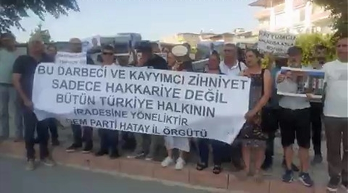 DEM Parti Hatay İl Örgütü, Hakkari Belediyesine yönelik kayyım atamasına ve irade gaspına yönelik basın açıklaması gerçekleştirdi.
