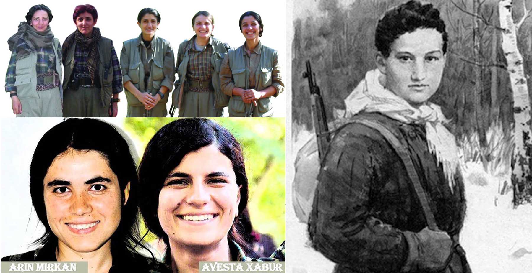 Alman Nazileri tarafından Sovyet anavatana dönük işgal karşısında direnen kahraman Partizan kadınların savaş sloganları, özgürlük haykırışları bugün Efrîn’de yankılanıyor. Nazi faşistleri karşısında sayısız özgürlük eylemine imza atan Sovyet Partizanlarından “Düşersek kahramanlar gibi düşeriz” diye haykıran Zoya’nın, idam sehpasına giderken bile cesaret ve cüretin sembol ismi Tanya’nın ideali ve düşü dün Kobanê’de, bugün Efrîn’de dolaşıyor.