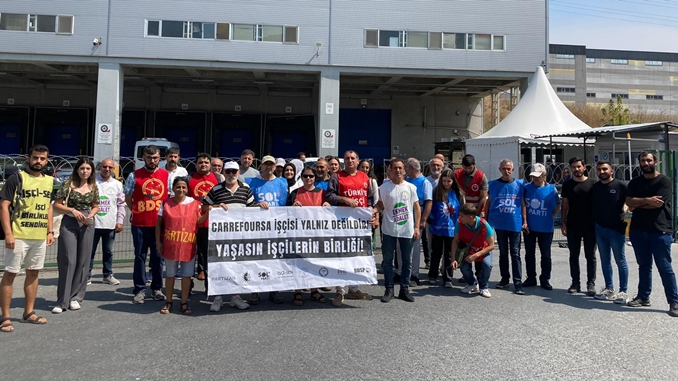“CarreforuSa İşçisi yalnız Değildir, Yaşasın İşçilerin Birliği” yazılı pankartla yapılan ziyarette “CarrefourSa işçisi yalnız değildir” sloganları atıldı.
