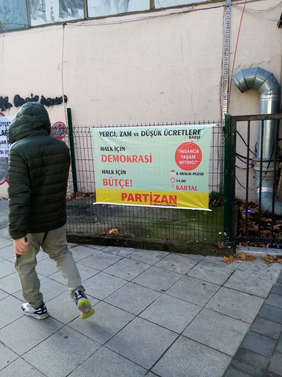 Partizan, İstanbul Kartal’da çeşitli bölgelerde pankartlar asarak 8 Aralık’ta Kartal’da düzenlenecek “İnsanca Yaşam” mitingine katılım çağrısını yineledi.