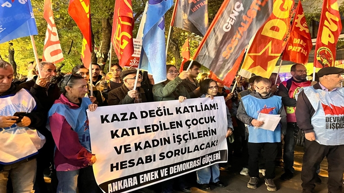 Ankara Emek ve Demokrasi Güçleri, Dilovası’nda yaşanan iş cinayetine ilişkin açıklamada bulundu. Yüksel Caddesinde yapılan açıklamada, “Kanıksamayacağız. Her gün yeni iş cinayetlerine uyanıyoruz. Sermayenin doymak bilmez kar hırsı her gün iş kazası adı verilen cinayetlerle aramızdan sınıf kardeşlerimizi koparıyor. Katledilen emekçilerin yaşamlarını ve anılarını değersizleştirmeye, çalınan hayatları rakama indirgemeye çalışıyorlar. İSİG Meclisi’nin raporuna göre sadece ekim ayında 169 işçi iş cinayetlerinde katledildi. Her ay 160, 180 işçi iş cinayetlerinde katlediliyor” denildi.