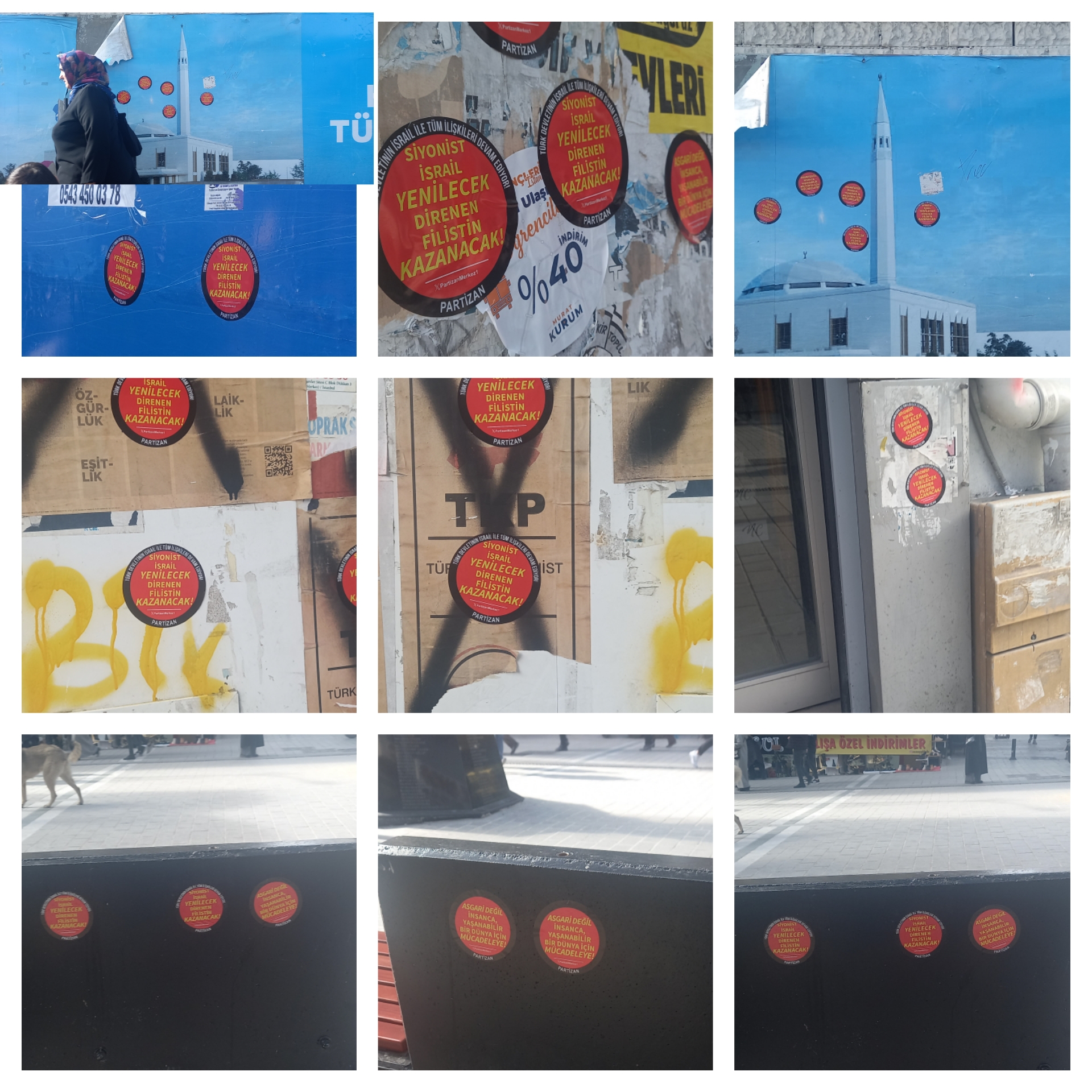 Partizan X hesabından yaptığı paylaşımda İstanbul’un çeşitli bölgelerinde “Siyonist İsrail Yenilecek Direnen Filistin Kazanacak!” ibareli sticker çalışması yaparak, Siyonist İsrail’in Filistin halkına yönelik saldırılarını teşhir etti ve katliamlarını kınadı.
