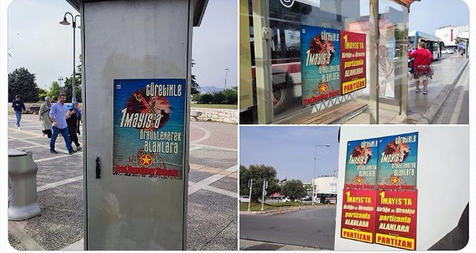İzmir Konak’ta otobüs duraklarına ve duvarlara; Partizan imzalı “1 Mayıs’ta Birliğe ve Direnişe Partizanla Alanlara” ile YDG imzalı “Cüretinle 1 Mayıs’a Örgütlenerek Alanlara” afişleri yapıldığını belirtti.