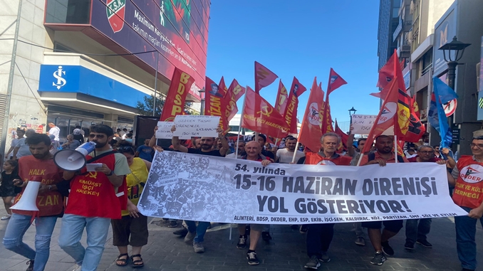 İzmir’de 15-16 Haziran direnişinin 54. yılında Karşıyaka’da çarşıda yürüyüş düzenlendi, Karşıyaka  İZBAN önünde açıklama yapıldı. “54. yılında 15-16 Haziran direnişi yol gösteriyor” pankartının açıldığı yürüyüşte atılan sloganlarla direniş selamlandı, 15-16 Haziran’dan öğrenileceği vurgulandı.
