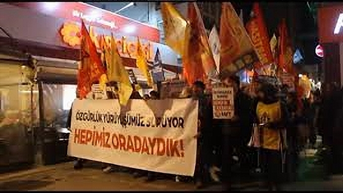 Alsancak ÖSYM binası önünden başlayan yürüyüşte, “Özgürlük yürüyüşümüz sürüyor. Hepimiz oradaydık!” yazılı pankart taşındı. Yürüyüş boyunca kitle sık sık “Kahrolsun faşizm, yaşasın mücadelemiz”, “Kurtuluş sokakta, sandıkta değil” ve “Bu daha başlangıç, mücadeleye devam” sloganları attı. Yapılan ajitasyonlarda, baskı ve tutuklamalara rağmen faşist rejime karşı mücadelenin sokakta, meydanlarda ve kampüslerde her yerde sürdürüleceği vurgulandı.