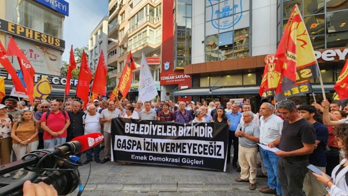 İzmir Emek ve Demokrasi Güçleri, “Kayyuma hayır! Halk iradesine evet” sloganıyla dün Türkan Saylan Kültür Merkezi’nin önünde toplandı. Aralarında Partizan’ında olduğu kitle, “Belediyeler bizimdir. Gaspa İzin vermeyeceğiz” pankartı açtı.