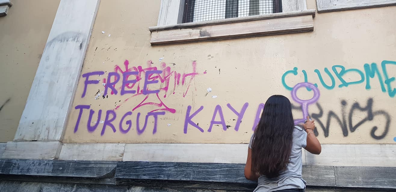 Avrupa’nın birçok bölgesinde faaliyet yürüten kadın Partizanlar, Atina’da Türkiyeli devrimci Turgut Kaya için yürütülen kampanyayı da sahiplenerek çalışmalarda aktif olarak yer alıyor. Kaya’nın açlık grevi direnişin 49’uncu gününde Atina sokaklarına mor spreylerle “Turgut Kaya’ya Özgürlük“ şiarını işleyen kadın Partizanlar, 20 Temmuz Cuma günü Sintagma meydanında yapılacak olan eyleme de çağrı yaptı.