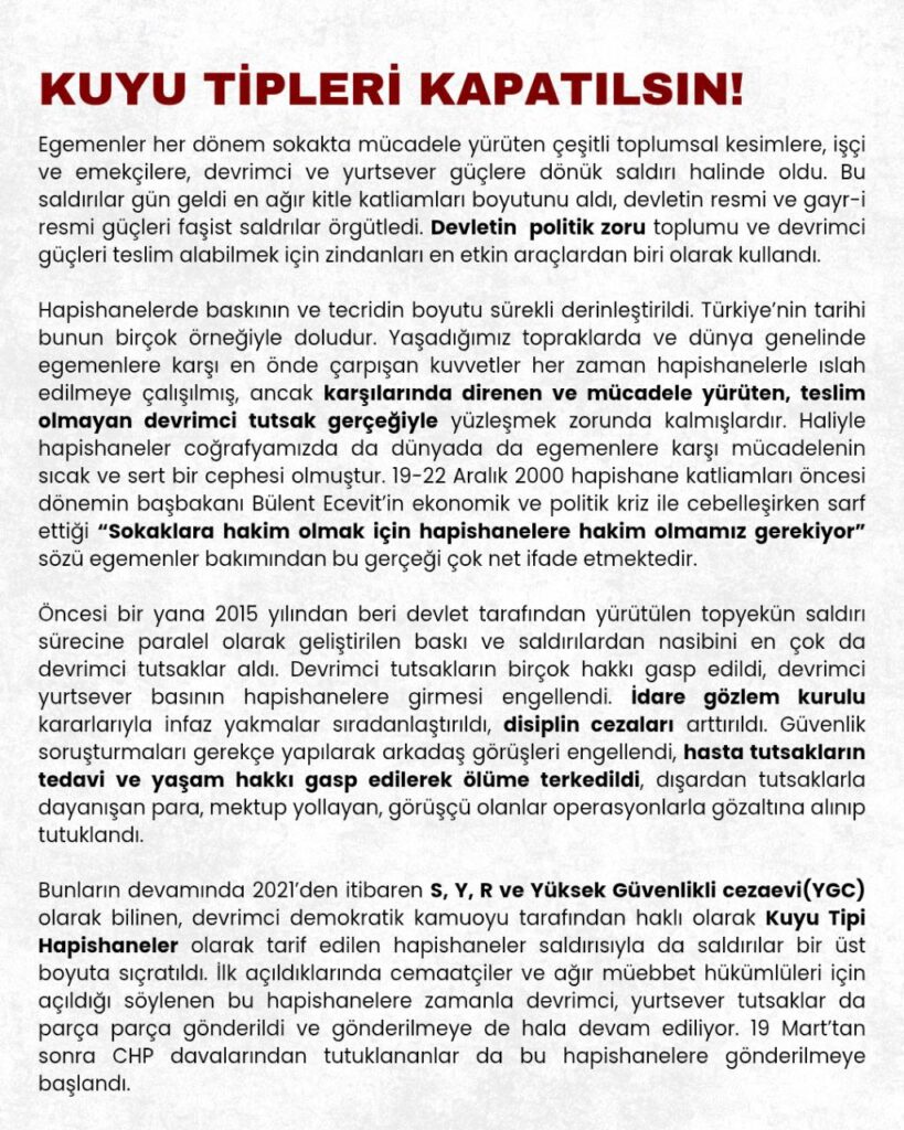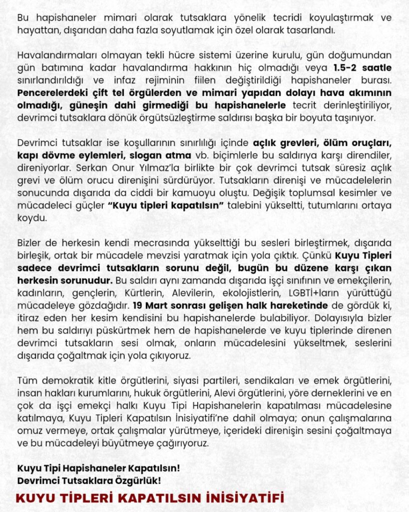 İnisiyatif, kuyu tipi hapishanelerin yalnızca devrimci tutsakların değil, düzene itiraz eden herkesin sorunu olduğunu vurguladı. Açıklama şu ifadelerle son buldu: