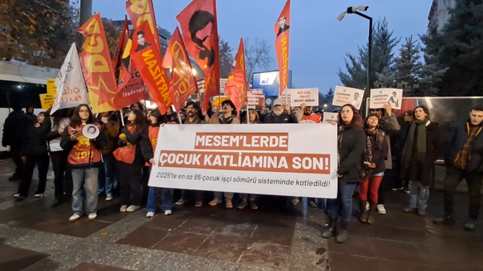 MEB önünde bir araya gelen kitle, “MESEM’lerde Çocuk Katliamına Son! 2025’te en az 85 çocuk işçi sömürülerek katledildi” yazılı pankart açtı. Eylemde, MESEM uygulamasının çocuk emeğini sömürüye açtığına dikkat çekildi.