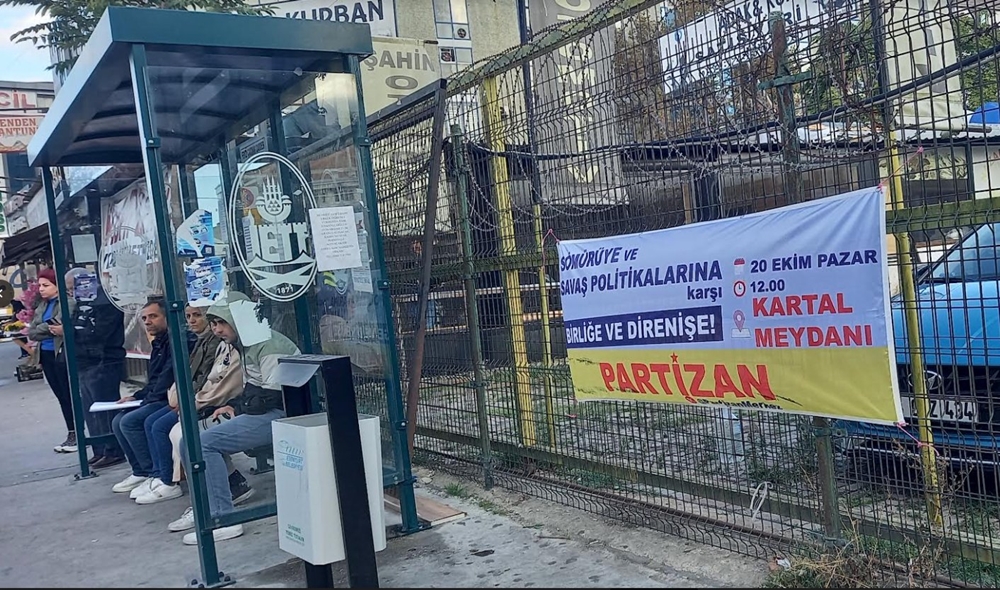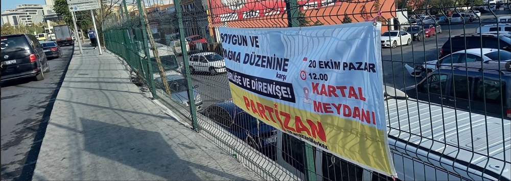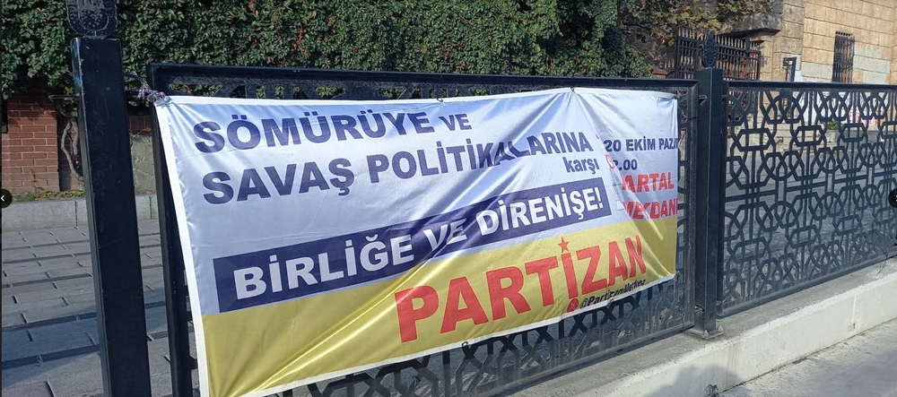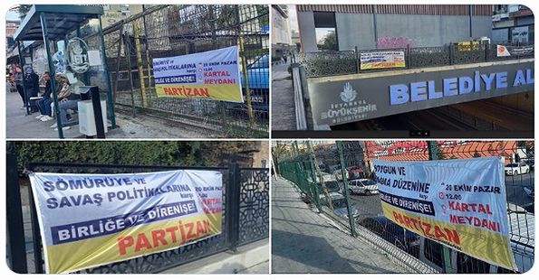 Partizan, İstanbul’un çeşitli bölgelerinde astığı pankartlarla İşçi Emekçi Mitingi’ne katılım çağrısında bulundu. Çeşitli bölgelere “Sömürüye ve Savaş Politikalarına Karşı, Birliğe ve Direnişe, Partizan”, “Soygun ve Yağma Düzenine Karşı , Birliğe ve Direnişe, Partizan”, imzalı pankartlar asan Partizan X Hesabı’ndan yaptığı paylaşımda; “Düşük ücretlere, vergi soygununa, hayat pahalılığına, savaş politikalarına; kadın ve LGBTİ+lara yönelik cinayetlere ve sokak canlılarının katledilmesine karşı topyekün direnişi büyütmek için 20 Ekim Pazar günü Kartal’da’yız!” ifadelerini kullandı.
