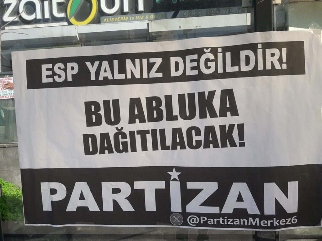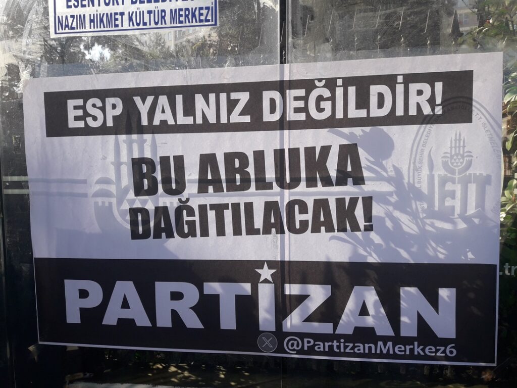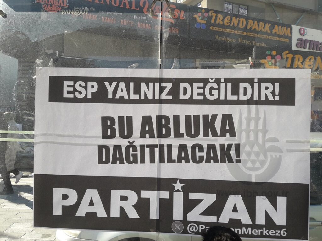 Partizan, İstanbul’da ESP ile dayanışma temelinde bir çalışma yürüttüğünü duyurdu. “ESP yalnız değildir! Bu abluka dağıtılacak! – Partizan” imzalı ozalitleri, başta Esenyurt olmak üzere birçok noktada asan Partizan, X hesabından konuya ilişkin yaptığı paylaşımda şu ifadelere yer verdi: