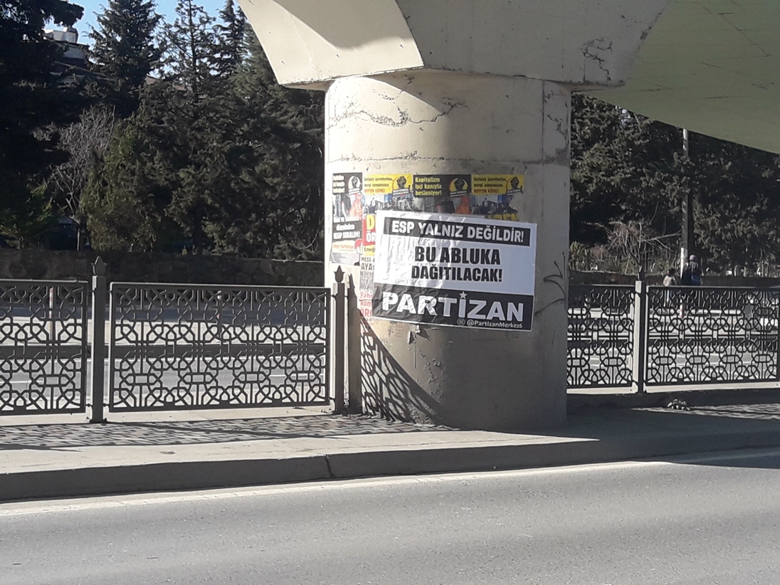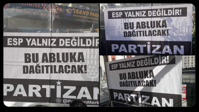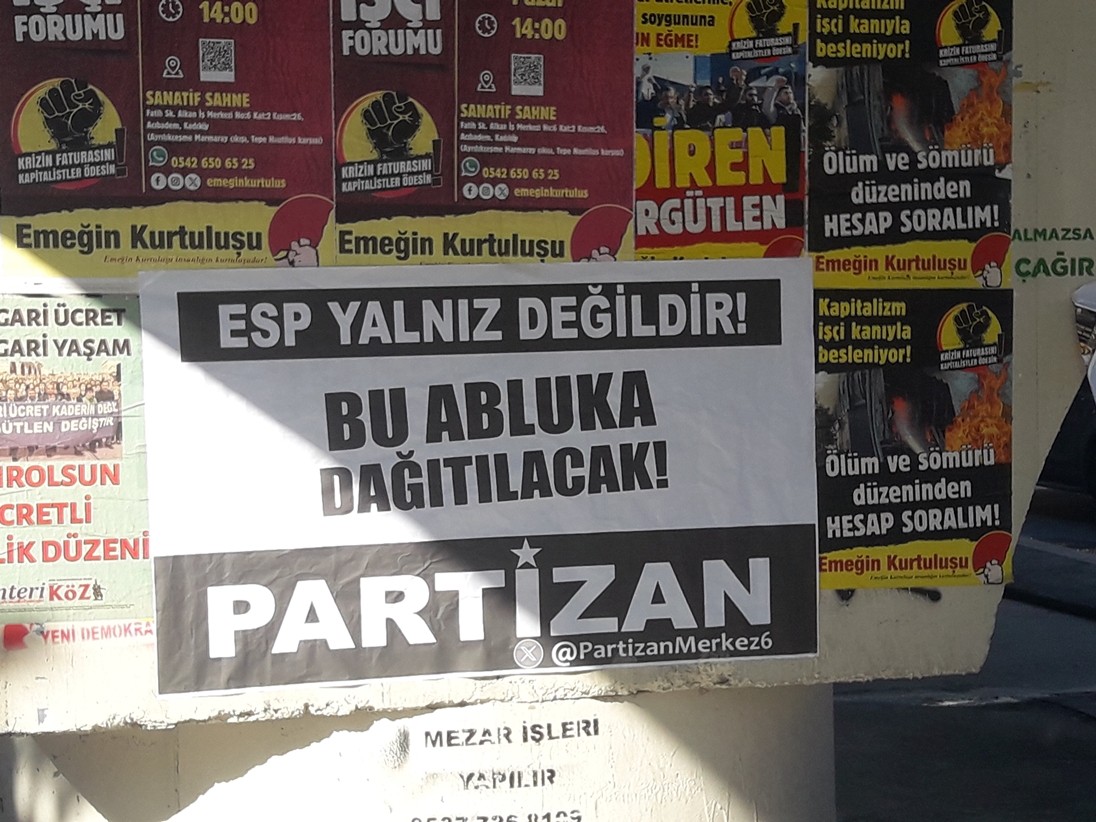Partizan, İstanbul’un çeşitli noktalarında astığı ozalitlerle ESP’ye yönelik gözaltı ve tutuklamalara karşı dayanışma çağrısı yaparak “ESP yalnız değildir” mesajını yineledi.