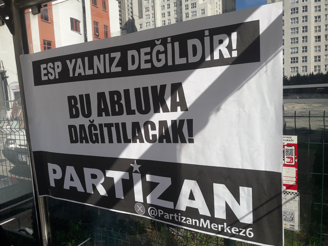 Partizan, İstanbul’da ESP ile dayanışma temelinde bir çalışma yürüttüğünü duyurdu. “ESP yalnız değildir! Bu abluka dağıtılacak! – Partizan” imzalı ozalitleri, başta Esenyurt olmak üzere birçok noktada asan Partizan, X hesabından konuya ilişkin yaptığı paylaşımda şu ifadelere yer verdi: