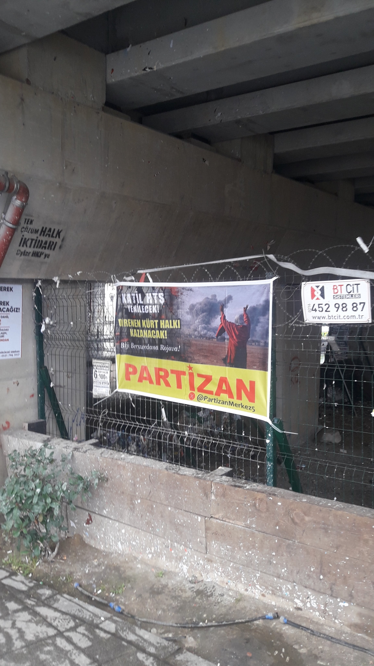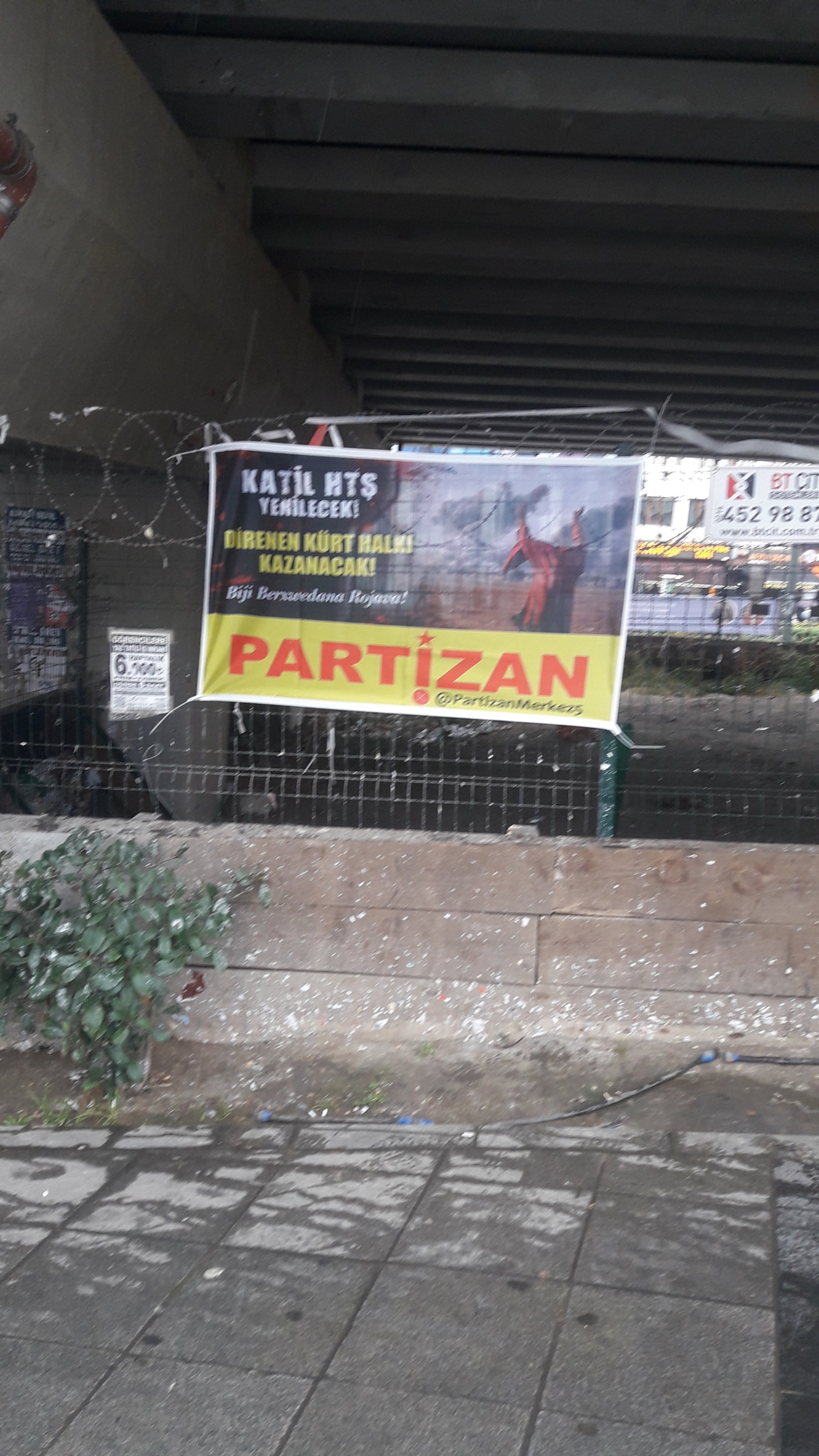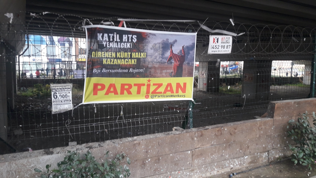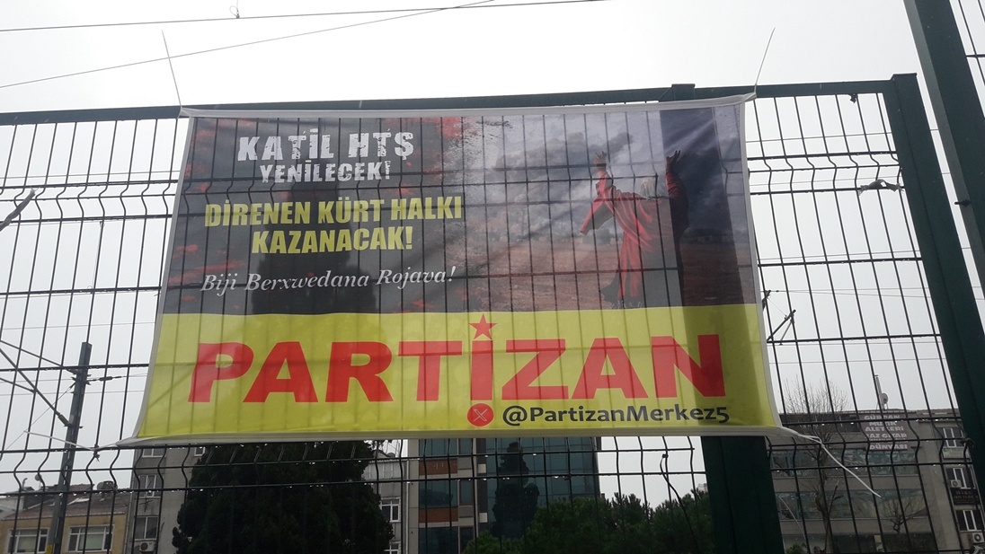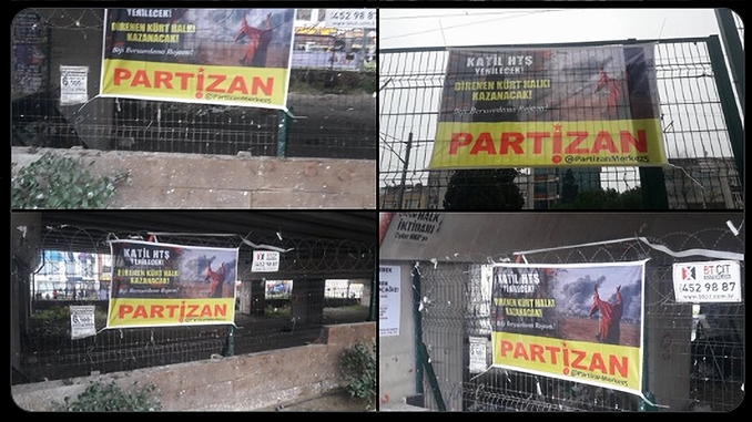 Partizan İstanbulun Kartal ilçesinde üzerinde Katil HTŞ Yenilecek Direnen Kürt halkı kazanacak! Bijî berxwedana Rojava!” yazılı pankartlar astı.