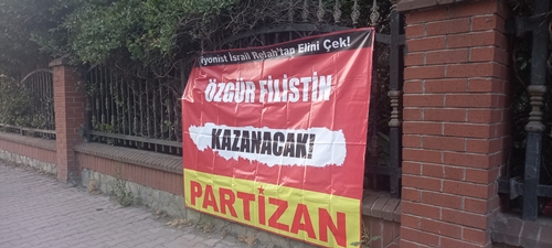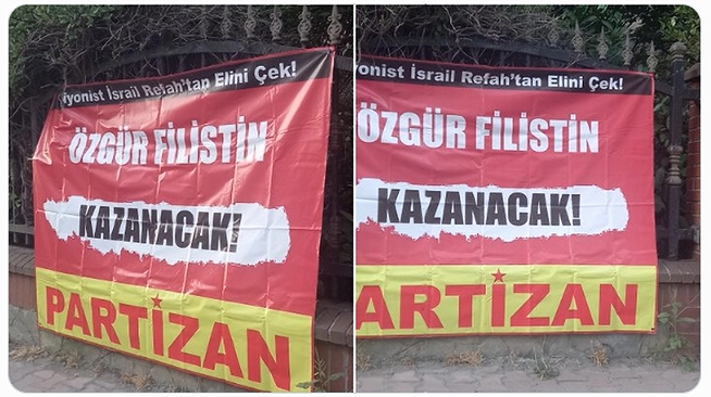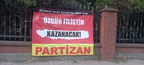 Partizan Siyonist İsrail devletinin Gazze-Refah bölgesine yönelik saldırıları karşısında pankart astı. “Siyonist İsrail Refah’tan Elini Çek! Özgür Filistin Kazanacak! Partizan” imzalı pankart astığını duyurdu.