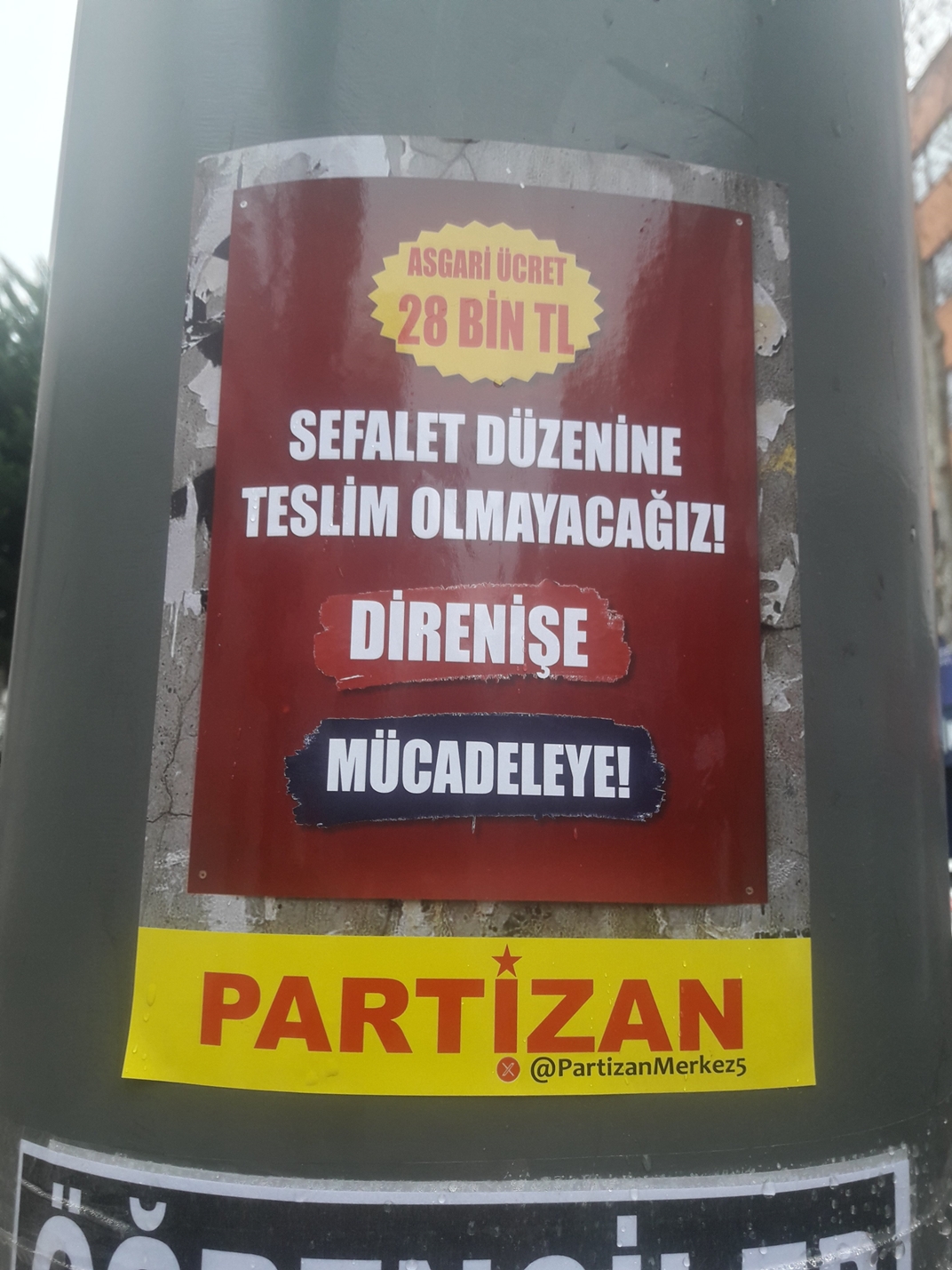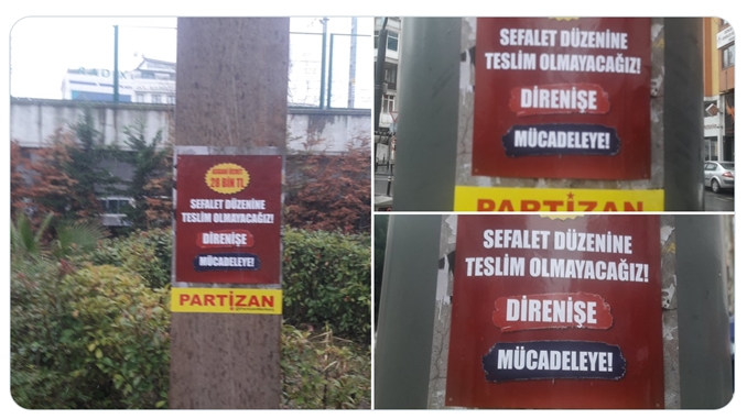 Partizan, “Asgari Ücret 28 Bin! Sefalet Düzenine Teslim Olmayacağız! Direnişe, Mücadeleye” içerikli afişler yaygın olarak yapıldığını duyurdu.