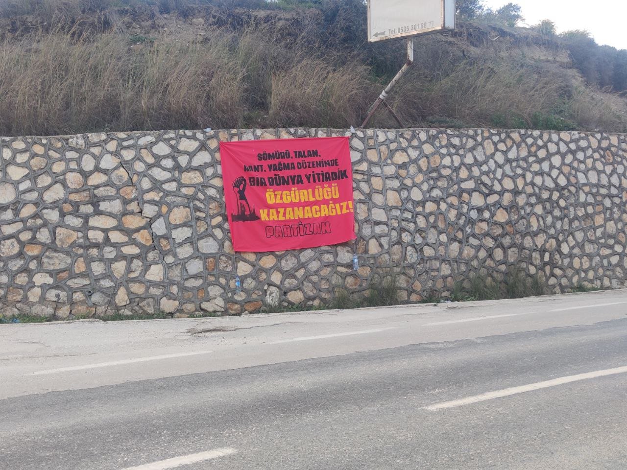 Partizan, X hesabından yaptığı paylaşımda depremin yıldönümünde Antakya’da “Sömürü, talan, rant, yağma düzeninde bir dünya yitirdik. Özgürlüğü Kazanacağız! PARTİZAN” imzalı pankart astı.