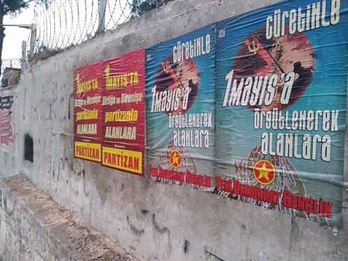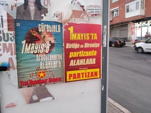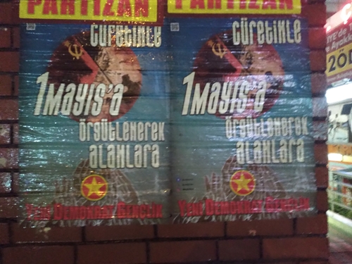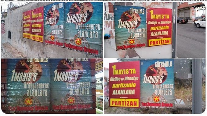 İzmir Çiğli’de Otobüs duraklarına ve duvarlara; Partizan imzalı “1 Mayıs’ta Birliğe ve Direnişe Partizanla Alanlara” ile YDG imzalı “Cüretinle 1 Mayıs’a Örgütlenerek Alanlara” afişleri yapılarak işçi ve emekçiler, halk gençliği 1 Mayıs alanlarına çağrıldı.