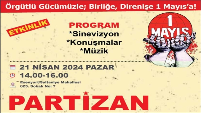 Partizan X Hesabı’ndan yaptığı paylaşımda “Örgütlü Gücümüzle Birliğe, Direnişe; 1 Mayıs’a!” çağrısıyla, Sinevizyon, Konuşmalar ve Müzik Programının olacağı 1 Mayıs etkinliğine çağrı yaptı.