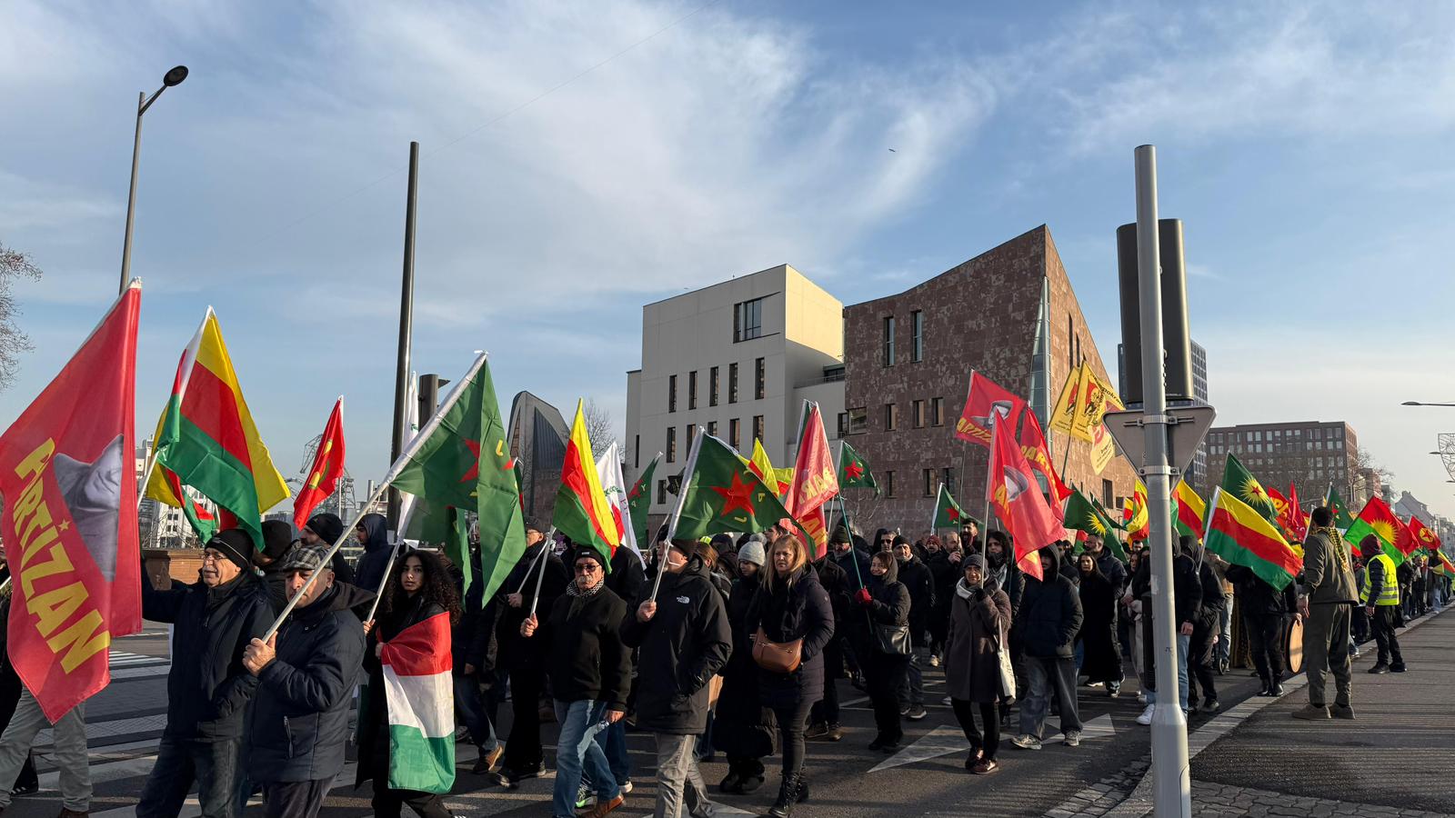 Kürdistanlı kurumlar, dost kuruluşlar ve siyasi partilerin destek verdiği yürüyüş, şehrin merkezi noktalarından başlayarak Ren Nehri üzerindeki köprüleri kapsayan güzergâh boyunca sürdü. Katılımcılar YPG ve YPJ bayrakları ile Kürdistan’ın dört parçasını temsil eden semboller taşıdı.