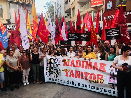 Anma açıklamanın ardından sloganlarla Gündoğdu Meydanına yapılan yürüyüşle devam etti. Burada son olarak Sivas’ta 31 yıl önce katledilen 33 can anısına denize bırakılan karanfillerle anma etkinliği bitirildi.