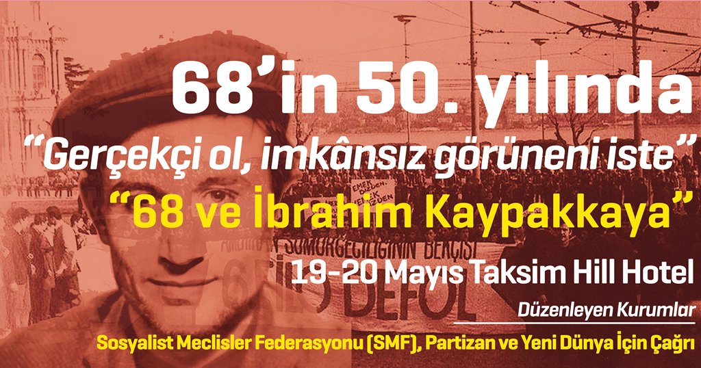 İstanbul’da 19-20 Mayıs tarihlerinde Sosyalist Meclisler Federasyonu (SMF), Partizan ve Yeni Dünya İçin Çağrı; 68’in 50. yılında “Gerçekçi ol, imkânsız görüneni iste” şiarıyla “68 ve İbrahim Kaypakkaya” sempozyumu düzenleneceğini duyurdu. Düzenleyen kurumlar, sempozyumuna dair görüşlerini kısaca özetleyerek katılım çağrısında bulundu.