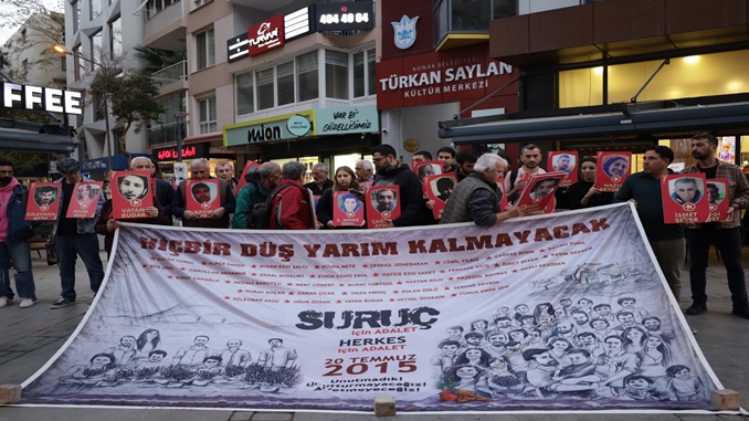 İzmir’de Alsancak’ta bulunan Kıbrıs Şehitleri Caddesindeki Türkan Saylan Kültür Merkezi önünde Suruç şehitlerinin fotoğraflarının yer aldığı, “Hiçbir düş yarım kalmayacak. Suruç için adalet herkes için adalet. 20 Temmuz 2015. Unutmayacağız, unutturmayacağız, affettirmeyeceğiz” pankartı ile 33’lerin fotoğrafları taşındı.