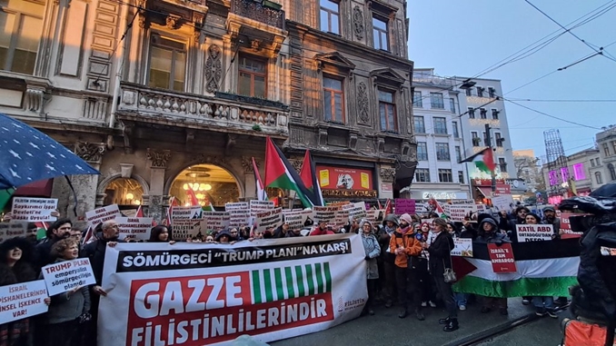 Filistin Eylem Komitesi’nin çağrısıyla Taksim Tünel’de bir araya gelen yüzlerce kişi, “Trump Planı”na karşı çıkarak Gazze’nin Filistinlilere ait olduğunu vurguladı ve işgal ile soykırım politikalarına son verilmesi çağrısı yaptı.
