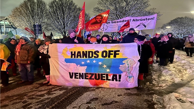 Ayrıca Venezuela’daki gelişmelerin Almanya’dan bağımsız olmadığına dikkat çekildi. Küresel ölçekte kâr ve çıkar odaklı politikaların savaşları körüklediği, Almanya’da ise sosyal devlet, eğitim ve sağlık alanlarında kesintiler yapılırken askeri harcamaların artırıldığı ifade edildi.