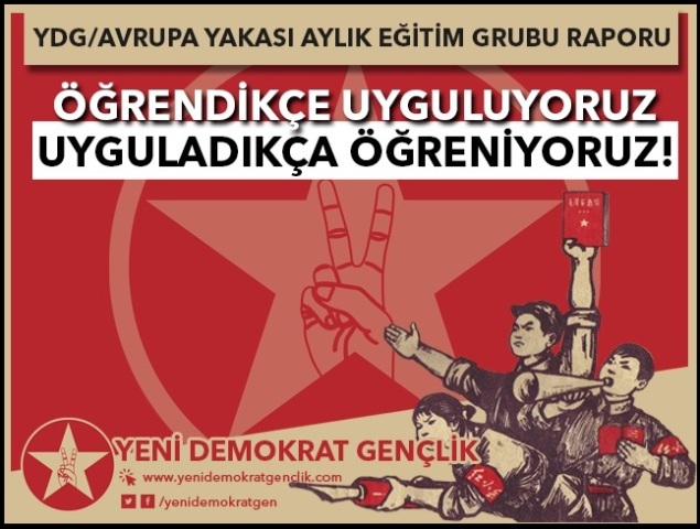 H. Merkezi: Sistemin halk gençliğine yönelik yozlaştırma, okuma-bilgilenme, araştırma-sorgulama kültüründen uzak tutma politikasına karşı haftalık periyodik şekilde eğitim çalışması gerçekleştiren Yeni Demokrat Gençlikokurları, eğitim çalışmalarının 1. bölümünü tamamladıklarını açıkladılar. Çalışmalarında Nisan Yayımcılık’tan çıkan Devrimci Eğitim ve Çalışma Üzerine kitabını kullanan okurlar, kitapta geçen konular üzerine tartışmalar yürüterek notlarını yazılı hale getirdiler.