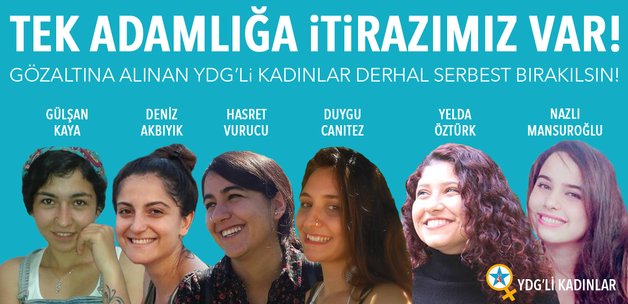 Devletin bu saldırılarının aslında farkına vardığımız gücümüzün ve yükselen kadın mücadelesinin, sokaklarda evlerde fabrikalarda üniversite kampüslerinde yükselttiği HAYIR’ın gücünün korkusu olduğunu biliyoruz. Erkek egemenliğinizi sarsacak olan Hayır’larımızla yüzleşeceğiniz gün yakındır. Biz genç kadınlar TC’nin kendisine başkaldıranlara uyguladığı sistematik saldırı politikalarına karşı itirazımızı dillendirmeye, Hayır demeye devam edeceğiz. Gözaltılarınız, tutuklamalarınız bizleri yıldıramayacak. Tecavüzcüleri aklayanların biat ettirme uygulamalarıyla kadınları ve kadın mücadelesini karşısına almaktan çekinmeyen, her türlü şiddeti meşrulaştırmaya çalışan devlet, biz kadınların cüretinin karşısında bozguna uğramaya mahkûmdur. Tek adamlık hayalleriniz kadınların öfkesinde, özgür yaşam hakkı mücadelesinde boğulacak. Kadınları korkutma, susturma çabalarınız boşuna. Bugün daha öfkeliyiz, direnen her bir kadından geliyor irademiz; bu yüzden artık daha güçlüyüz. Gözaltına alınan YDG okurları ve Özgür Gelecek muhabiri serbest bırakılsın!